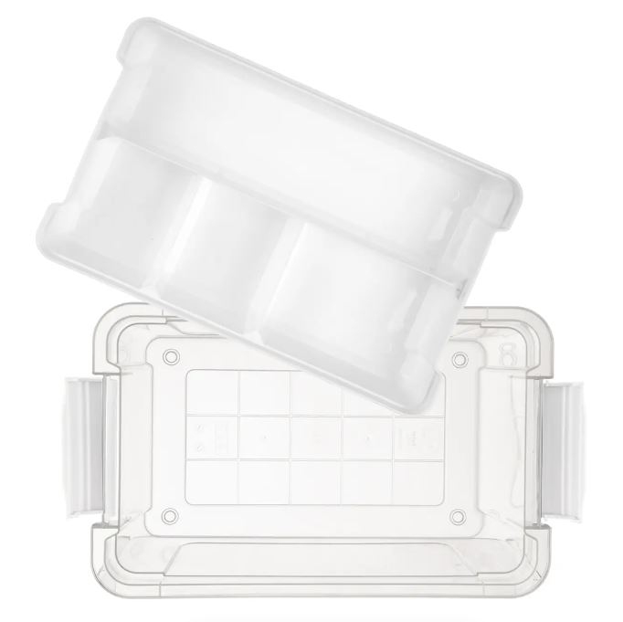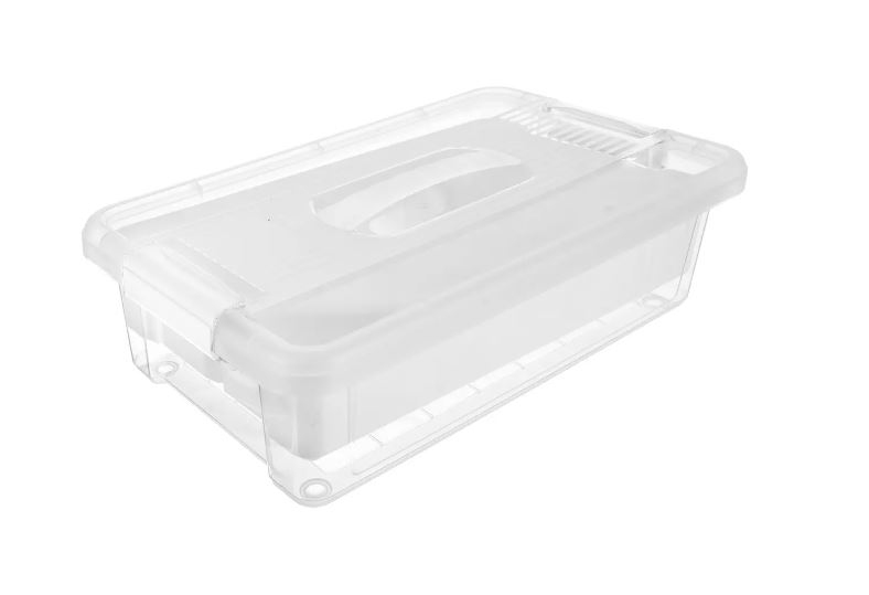 Box obdélníkový transparentní s víčkem na dva pevné klipy. Stohovatelný. Uvnitř vyjímatelný vklad s přihrádkami. Skvělé využití v domácnosti, v dílně, na šití, kosmetiku, v nemocnicích a zdravotních střediscích, domovech důchodců. Materiál: plast PP. Rozměry: objem 6 l, 35x23x10,5 cm. Vhodný do myčky.| Výrobce: | Orion |
