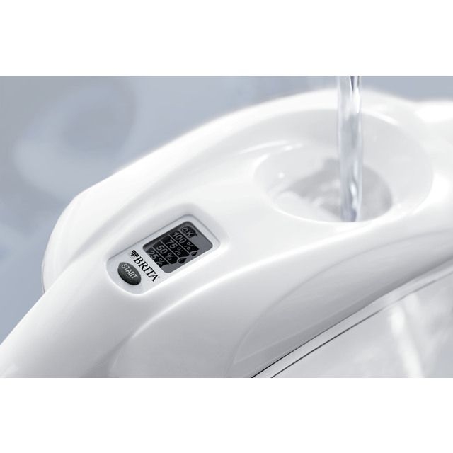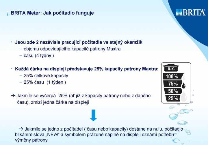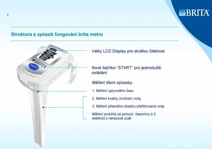 Filtrační konvice Brita Elemaris METER cool bílá METER: Nový elektronický indikátor výměny patrony automaticky upozorňuje na nutnost výměny filtrační patrony každé 4 týdny (měří třemi způsoby). Využívá Maxtra - novou filtrační patronu BRITA se čtyřstupňovou filtrací pro snížení tvrdosti vody. Unikátní integrované víčko nálevky, pro jednu ruku, snadné plnění. Moderní, stylové provedení Ideální na jídelní stůl Ergonomické provedení zaručuje pohodlné uchopení Neklouzavé držadlo s měkkým povrchem Objem značený na konvici Kruhový pryžový podstavec Objem přefiltrované vody 2,2 l, celkový objem 3,5 l 1 patrona Maxtra v ceně Inteligentní indikátor BRITA Meter je oproti starším typům indikátorů (Memo, Calendar) vybaven měřícími elektrodami. To má za následek mnohem přesnější určení okamžiku, kdy je potřeba vyměnit filtr. Již není odměřován pouze čas používání filtru, ale díky dvěma nerezovým elektrodám, které jsou v indikátoru použity, je snímán také objem přefiltrované vody a tvrdost vstupní vody. V závislosti na změřeném objemu a tvrdosti je vyhodnocována zbývající kapacita filtru. Displej lze rozdělit na tři části - symbol filtru s nápisem O.K., symboly kapek a čtyři segmenty (čárky). Nejdůležitější částí jsou, stejně jako u indikátoru Memo, čtyři čárky informující o stavu filtru. Jedna čárka zmizí buď z důvodu vyčerpání 25% časového limitu (1 týden) nebo při poklesu celkové kapacity filtru o 25%, podle toho, co nastane dříve. V případě, že z displeje zmizí poslední čárka, začne blikat nápis "NEW" a zobrazení filtru s nápisem O.K. se změní na symbol prázdného filtru. Takto jste upozorněni na nutnost filtr vyměnit a máte zaručenou vždy optimální kvalitu filtrované vody BRITA. Poslední částí displeje jsou symboly kapek, které jsou aktivní v případě, že filtrem protéká voda. Jde o informaci pro uživatele konvice, že část indikátoru, měřící přefiltrovaný objem, je funkční.
