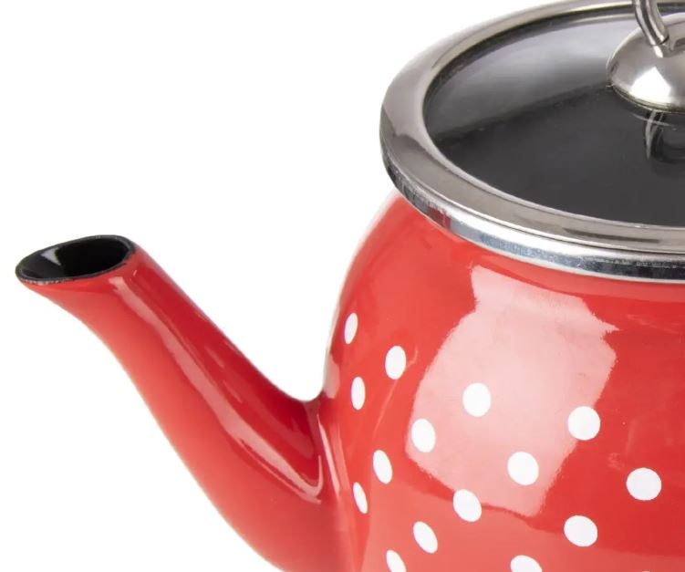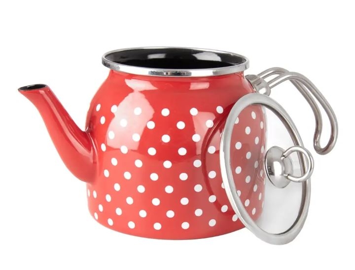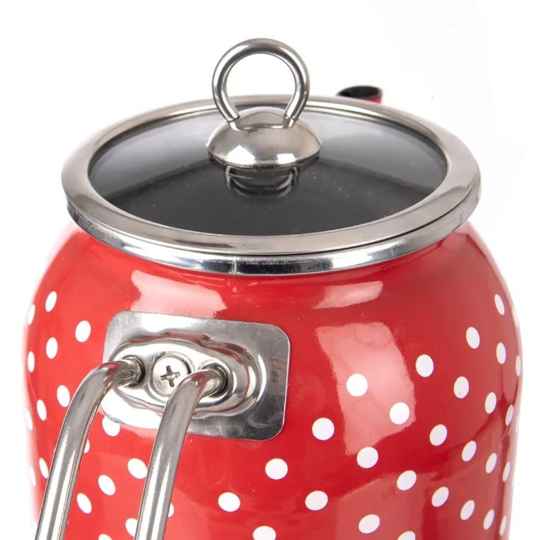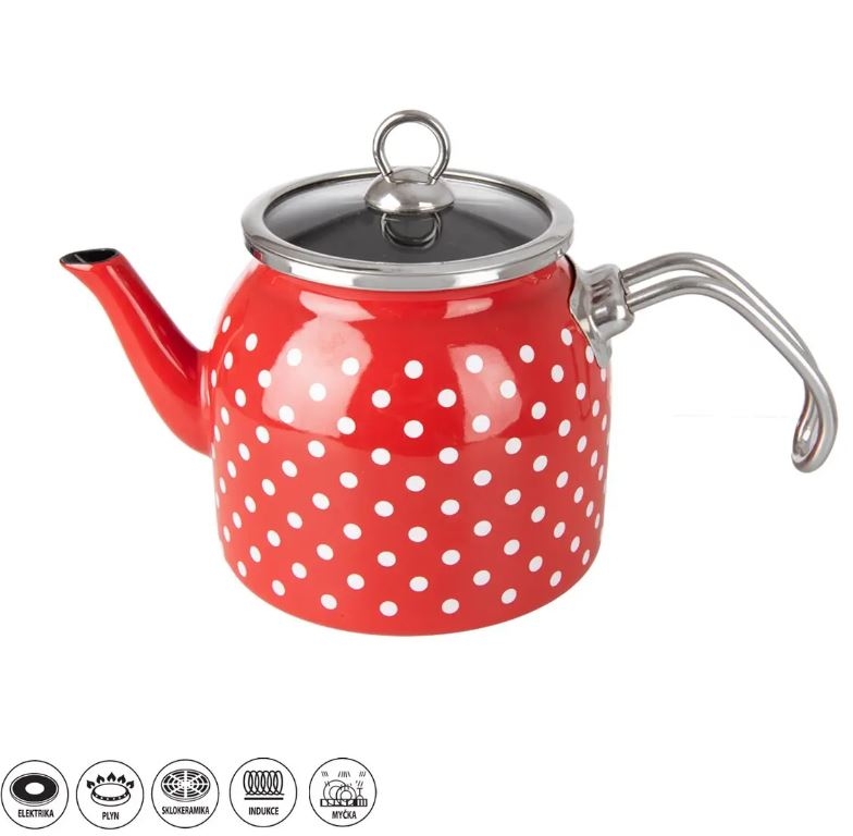 Materiál: smaltovaný plech, nerezová ocel (lem), kov s povrchovou úpravou (držadlo a knob), sklo (poklice).