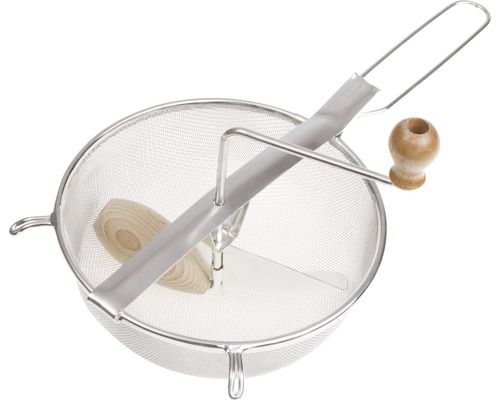 Pasírovač se převážně využívá k pasírování zeleniny pro přípravu svíčkové, rajské omáčky i pro pasírávání vařené zeleniny včetně brambor pro zahuštění polévek a velké využití najdete při přípravě dětských pokrmů. Využití pasírovače najdete i při pasírování ovoce k zavařování marmelád, lze pasírovat ovocné plody jako jahody, rybíz, angrešt, rakytník, borůvky, maliny, odpeckované třešně, višně apod. Suroviny pro přípravu chutney lze též rozmělnit za použití pasírovače. Pasírovač je vyroben z nerezového kovu. Po celém objemu pasírovače je připevněno k obrubě síto s přiměřeně velkými otvory. Držadlo je dlouhé 16 cm. Přes střed síta je kovový pás, kterým je středem přichycena tyč s držadlem pro ruční otáčení. Na opačné straně tyčky je přichycena kovová pasírovací lopatka a dřevěný otáčivý váleček, doléhající při pasírování na zeleninu, kterou otáčním stlačuje přes síto do vámi připravené nádoby. Průměr: 18 cm, výška 9 cm. Pasírovač po použití co nejdříve umyjte vodou a očistětě nejlépe za pomocí kartáčku přichycené zbytky zeleniny. Nedoporučujeme do myčky na nádobí, myčka se ze zbytků zeleniny zanáší a na sítu pasírovače se tvoří hnědé skvrny. | Výrobce: | Blex |