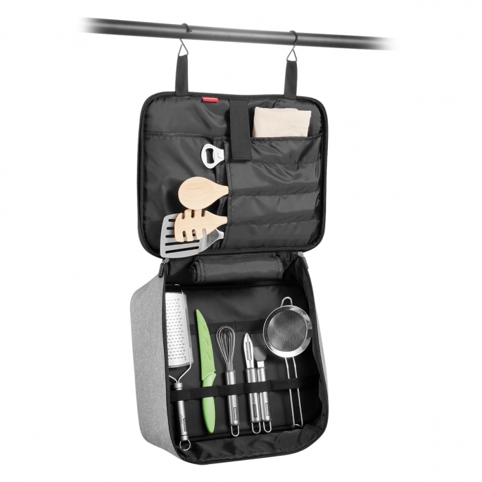 Pohodlně a přehledně do něj uložíte a bezpečně v něm přepravíte všechny základní kuchařské potřeby včetně pánve s poklicí, krájecí desky i základní kuchyňské nářadí s dlouhou či krátkou rukojetí.