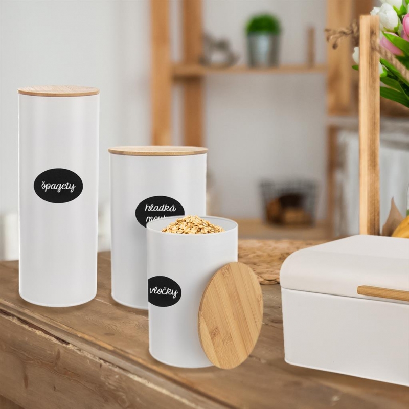 Dóza s víčkem na uložení čaje, kávy... Materiál: plech, bambus, silikon - těsnění.