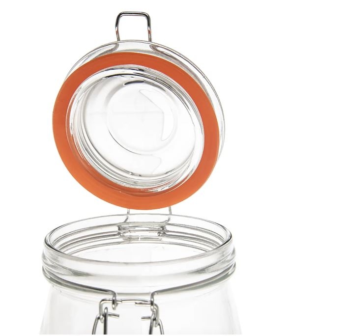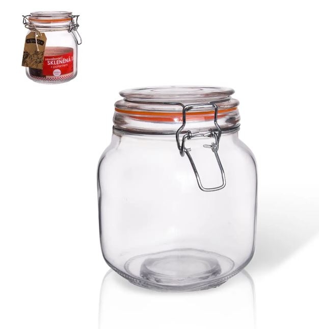 Dóza skleněná patentní s klasickým silikonovým těsněním a drátěným uzavěrem. Rozměry: objem 1 l, 12x12x14,5 cm. Náhradní těsnění v naší nabídce 180516.| Výrobce: | Orion |