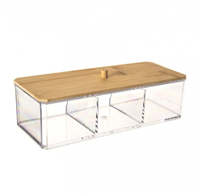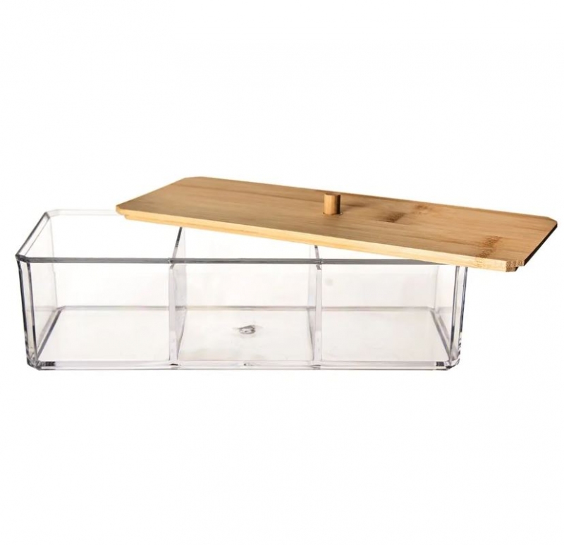Kosmetická dělená dóza s víčkem uloží vatové tampóny i jiné kosmetické potřeby nebo líčidla. Využít ji můžete v koupelně ale i jinde v domácnosti na různé drobnosti. Dělena do tří sekcí. Materiál: plast, bambus. Rozměry: 23,5x9,5x6,5/7 cm. Celý popis >