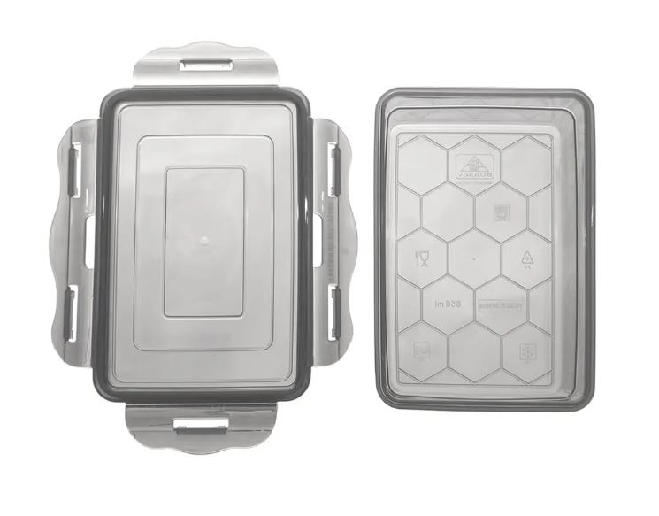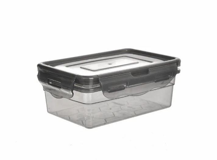 Dóza plastová hranatá transparentní se silikonovým těsněním ve víčku a s klipy pro pevné uzavření. Celý popis >