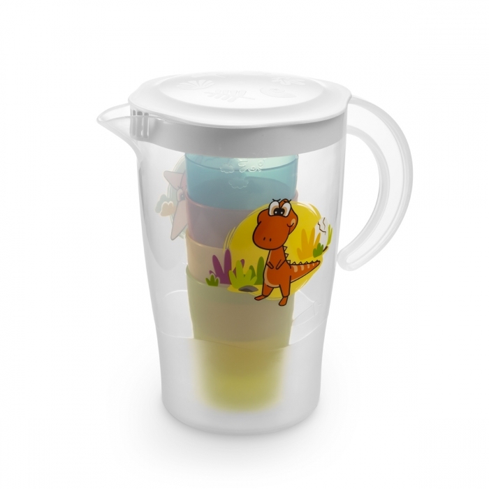 Souprava DINO je ideální zejména při zahradním stolování a podávání nápojů dětem. Souprava je perfektně skladná, kelímky lze vzájemně stohovat a skladovat uvnitř džbánu.