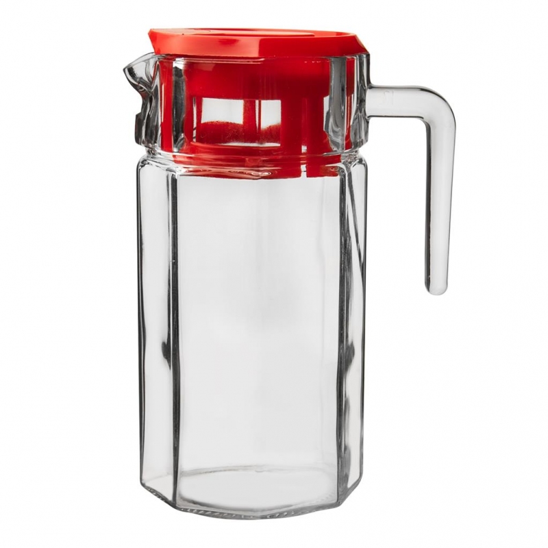 Džbán s uchem, výlevkou a plastovým víčkem. Materiál: sklo, plast. Rozměry: objem 1,6 l, s použitím víčka 1,5 l, pr. 11 cm, v. 23 cm. Je vhodný pro teploty do 60 °C, lze ho mýt v myčce na nádobí.| Výrobce: | Orion |