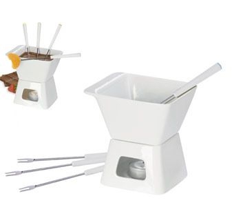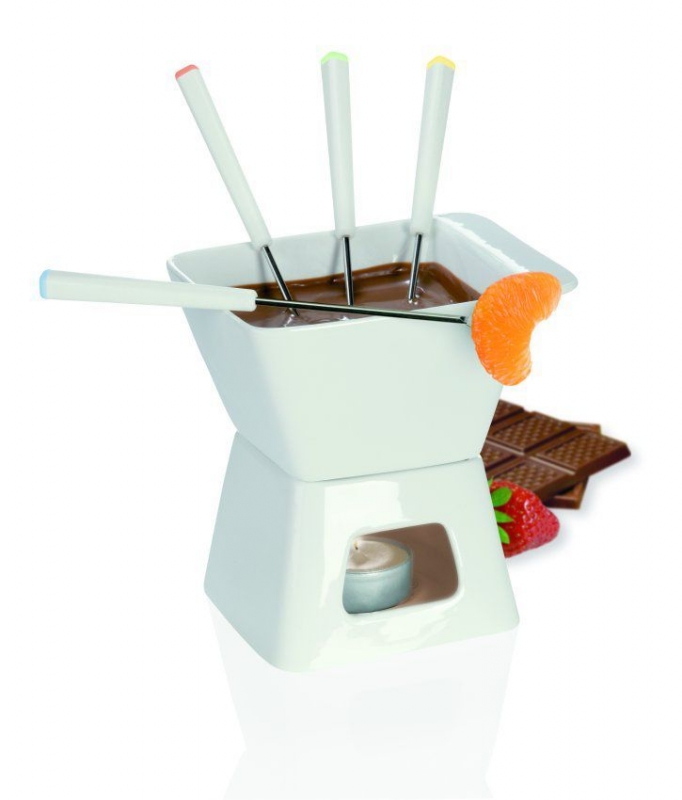 Elegantní souprava vynikající pro přípravu čokoládového fondue. Čokoládové fondue GUSTITO Tescoma je vyrobeno z prvotřídního žáruvzdorného porcelánu. Součástí fondue jsou 4ks vidliček z kvalitní nerezavějící oceli a odolného plastu,které mají barevně rozlišené rukojeti. Fondue je mrazu i žáruvzdorné -18/+200 °C. Vhodné do ledničky, mrazničky, mikrovlnné trouby a myčky. Moderní funkční design, dokonalé zpracování. Souprava obsahuje: podstavec na svíčku miska na fondue vidlička, 4 ks čajová svíčka rozměry: výška: 13cm, šířka: 13cm, délka vidličky: 18cm Tip: čokoládové fondue na fondue použijte jakoukoliv čokoládu,kterou máte rádi-může být mléčná,hořká,dokonce i bílá. Fantazii se meze nekladou a to ani při výběru ovoce,zkuste ananas,švestky,hroznové víno,jahody nebo banán.