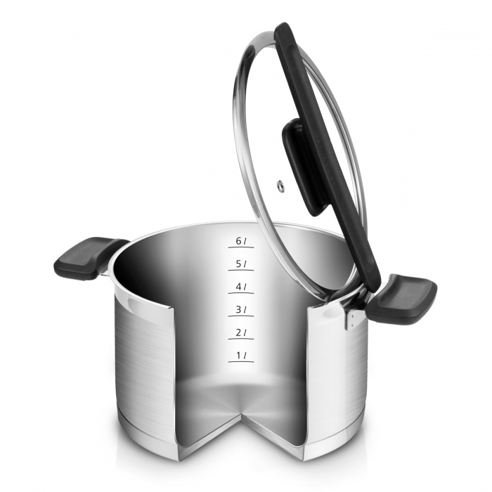 Zabírá při skladování společně s ostatními hrnci a kastroly linie COMPACT