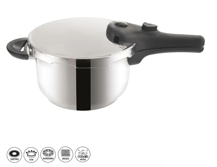 Tlakový hrnec z kvalitní nerezové oceli se sendvičovým dnem s termoakumulačními vlastnostmi. Hrnec je vhodný na všechny typy tepelných zdrojů včetně indukce. Zaručuje ekonomické vaření – krátká doba přípravy pokrmů a značná úspora energie. Tepelný zdroj vypínáme s předstihem – naakumulovaná energie předává teplo dále do nádoby. Součástí ventilu je barevný sloupec, který vás informuje o míře natlakování. Je nutné plnit hrnec vždy pouze do označené výšky hladiny MAX. Součástí výrobku je návod na obsluhu a údržbu. Materiál: nerezová ocel 304, plast (bakelit), silikonové těsnění. Rozměry: objem celé nádoby (ne objem pracovní) 4 l, pr. 22 cm, v. 12 cm, s poklicí 16 cm, d. s rukojetí 45 cm. Lze mýt v myčce.| Výrobce: | Orion |