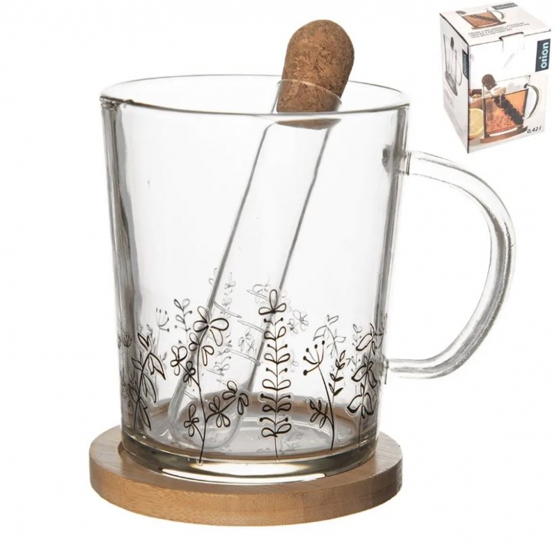 Skleněný hrnek s dekorem s dřevěným podšálkem a infuzérem na louhování čaje v nevšedním provedení. Celý popis >