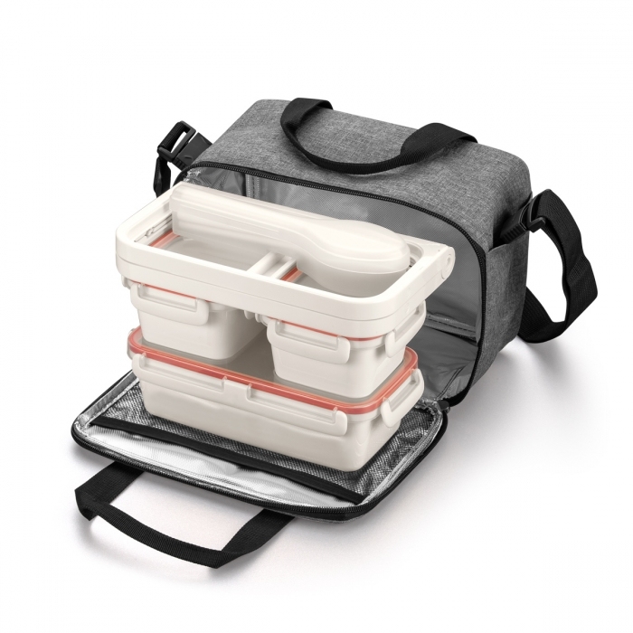 Tři vzduchotěsné dózy s novými sklápěcími uzávěry jsou v soupravě FRESHBOX doplněny skládacím servírovacím podnosem a jídelním příborem uloženým v ochranném pouzdru. Pokrmy ve vzduchotěsně uzavřených dózách při přenášení nevytékají a v termobrašně si déle zachovají svou teplotu. V případě potřeby můžete pokrmy přímo v dózách s pootevřenými víčky ohřívat v mikrovlnné troubě.