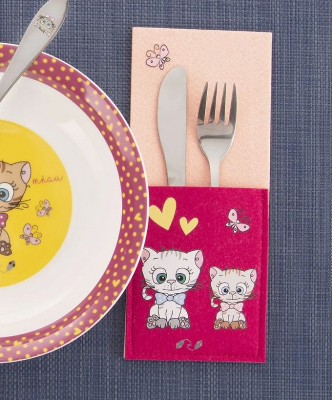 Kapsa na příbory s dětským dekorem KOCOUŘI ozdobí prostřený stůl. Materiál: polyester (filc), plastový potisk. Rozměry: 21x9 cm.| Výrobce: | Orion |