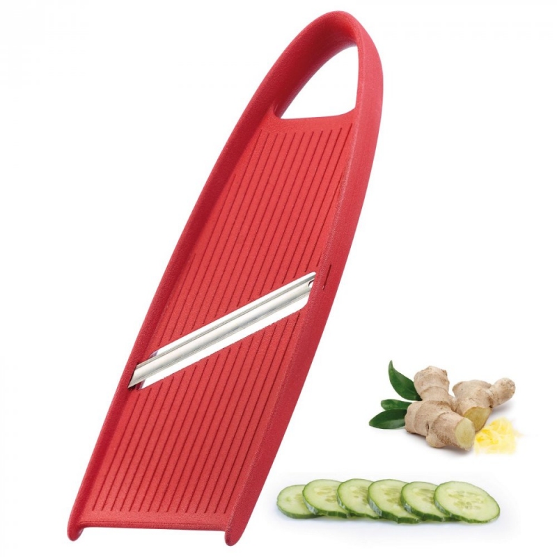 Velmi praktické struhadlo s oboustrannou velmi ostrou čepelí ovoce nebo zeleninu nakrájí v mžiku na plátky. Vhodné na salátové okurky, cukety, lilek, cibuli a podobně. S třecím struhadlem na sýr, zázvor, ovoce a další.rozměry: 230 x 74 x 11 mm