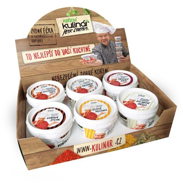 Tato kazeta je ideální na letní grilování, ale využijete ji určitě i při vaření a pečení ve Vaší kuchyni. Kulinář Kazeta koření 6 ks na gril velká obsahuje koření Zlatá pečínka 80 g, Krkovička gril 100 g, Mexiko gril 70 g, Bylinkové máslo 60 g, Voňavý steak 70 g, Medvědí sůl 90 g. Každé koření je baleno v praktickém plastovém kbelíčku. Kbelíčky jsou stohovatelné, takže Vám ušetří místo v kuchyni. Tato sada je dodávána v dárkové krabičce, takže je ideální jako dárek s kterým určitě nešlápnete vedle. Koření Kulinář Petr Stupka, klíčové vlastnosti: Koření je vyrobeno pouze z čerstvých a kvalitních sušených bylin, zeleniny, koření a mořské soli. Ve směsích nejsou žádná „Éčka“, ochucovadla a nepřirozené prvky. Koření obsahuje pouze 15% mořské soli. Balení v plastových kyblíčcích zaručuje dlouhou trvanlivost, umožňuje praktické použití a přehledné stohovatelné uložení. Kulinář Petr Stupka je chráněná česká značka garantující vysokou kvalitu nabízeného koření. Koření Kulinář vyrábí Jiří Červenka - Tábor - Sezimovo Ústí v certifikovaném provozu. Správné použití - Pro směsi bylin, zeleniny a koření všeobecně platí, že stačí jen poměrně krátké povaření, podušení či dopékání a proto je přidávejte do pokrmů v závěrečné nebo konečné fázi úpravy. Chuťové a vonné látky v každém koření ničí přílišný žár, rozpálený tuk, prudký gril nebo trouba nad 180°C. Zkuste si cenu Koření Kulinář přepočíst na gramy a porovnejte ji s konkurencí, popřípadě vyhodnoťte obsah soli ve směsích. Nakonec přivoňte a porovnejte kvalitu.