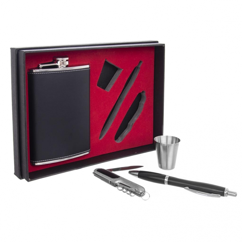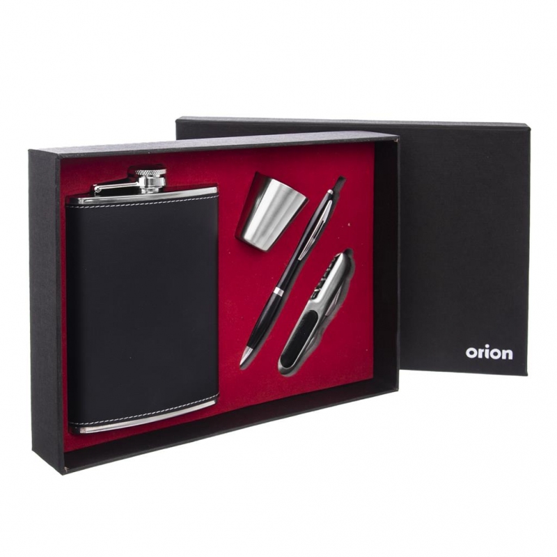 Rozměry: lahvička - objem 0,24 l, 9,5x2,5x14,5 cm, odlivka pr. 3,5 cm, v. 4 cm, propiska d. 14 cm a nůž 9 cm. Celý popis >