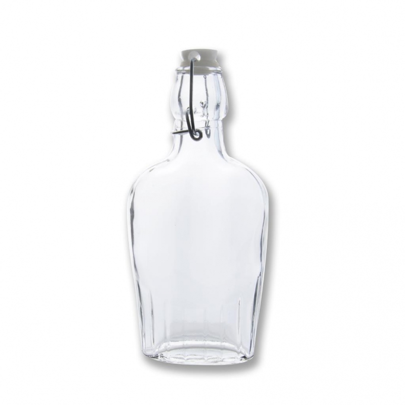 Láhev na slivovičku, rum, a jiné posilující nápoje. S pákovým uzávěrem s těsněním. Materiál: sklo, kovová přezka. Rozměry: objem 0,28 l, 9x4x20 cm.| Výrobce: | Orion |