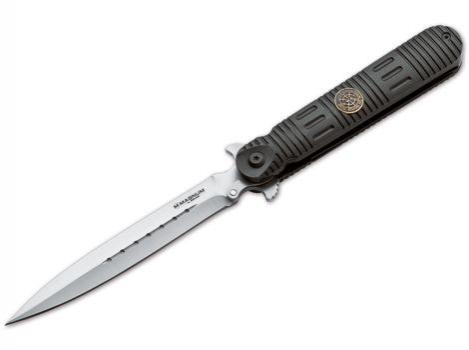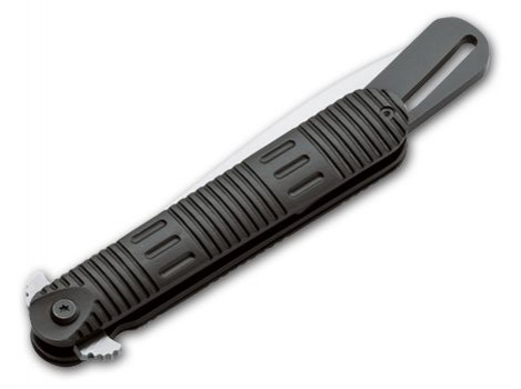 Geniální technické provedení umožňuje nůž bezpečně nosit ve složeném stavu navzdory jeho neobvyklým proporcím, protože při sklápění nože se automaticky vysouvá ochranný kryt čepele a zakrývá špičku nože. Černá anodizovaná hliníková rukojeť nese znak SWAT.