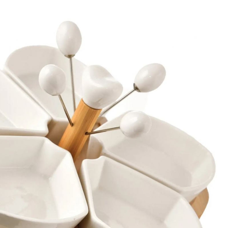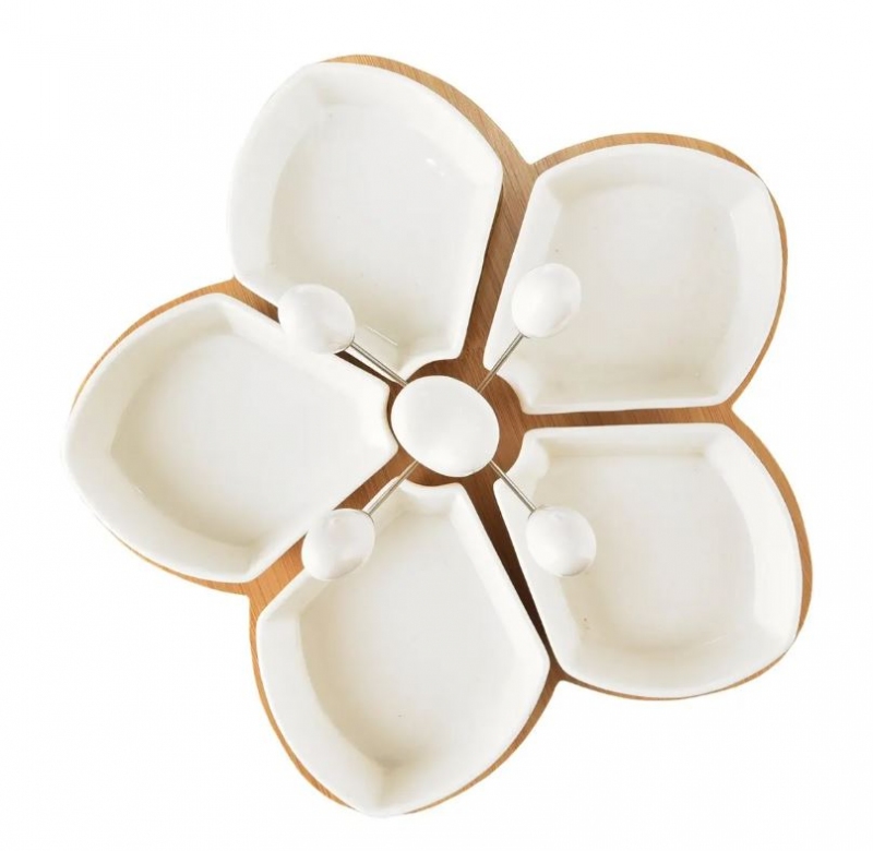Servírovací set pěti tvarovaných misek a čtyř napichovátek na tácku. Celý popis >
