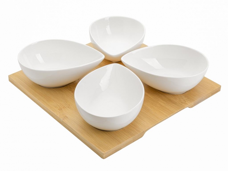 Sada 4 porcelánových misek na bambusovém podstavci. Délka postavce 27 cm, šířka postavce 27 cm, výška misky 6,5 cm. Celý popis >