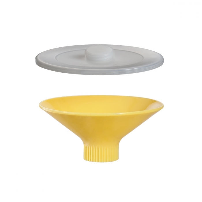 Šroubovací uzávěr použité PET láhve je při skladování nasazený na krytu nálevky, takže se během shromažďování oleje neztratí.