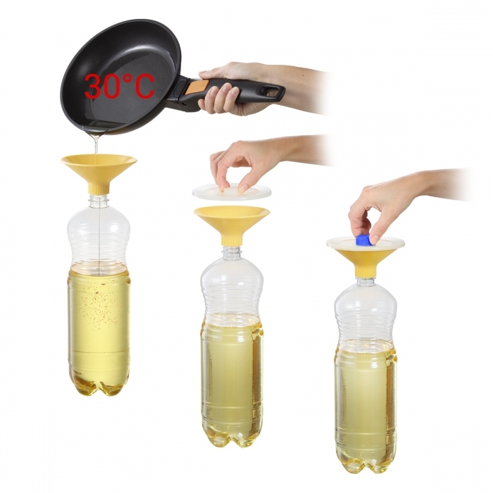 Místo vylití do dřezu se použitý olej shromažďuje v běžné použité nápojové PET láhvi s nasazenou nálevkou PRESTO, která je během skladování uzavřená krytem.