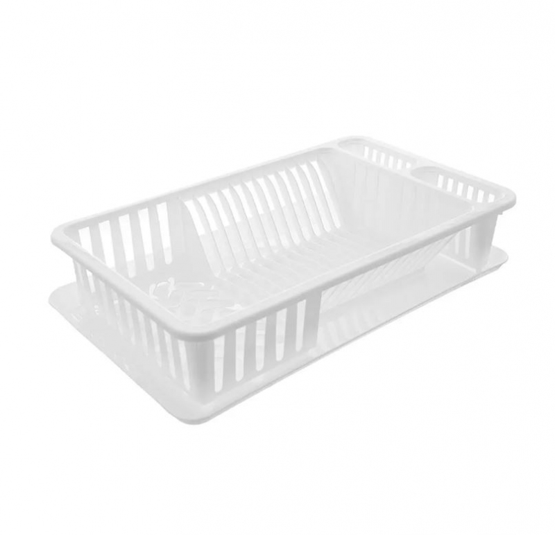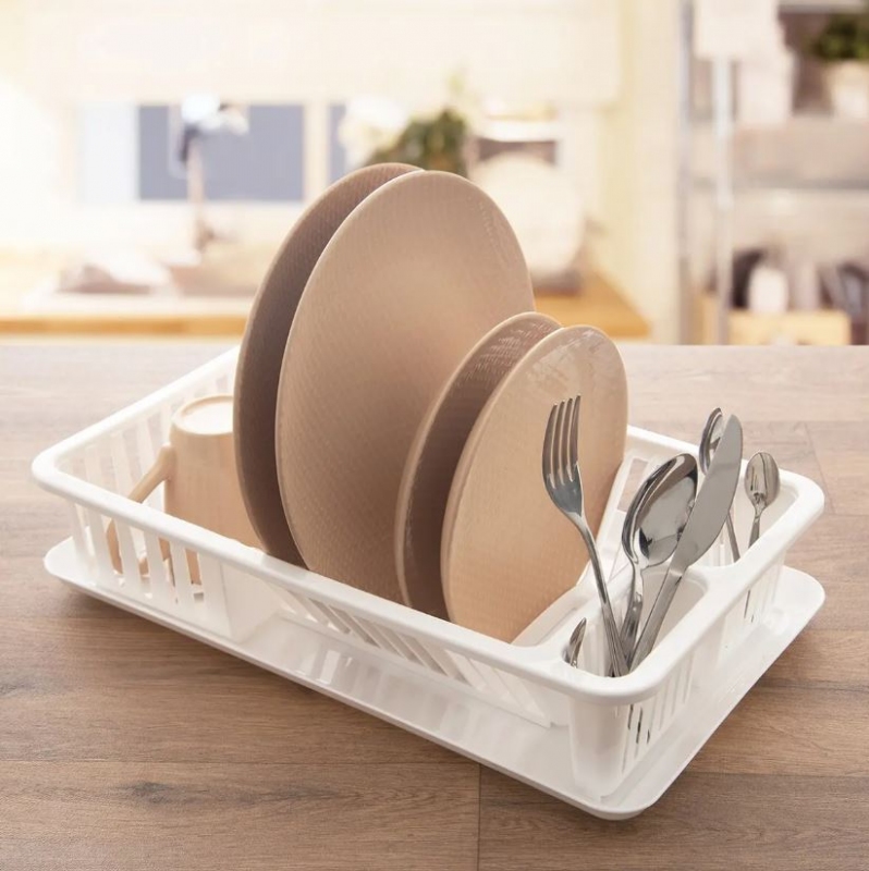 Odkapávač na nádobí s tácem. Členěný na sekce na příbory, talíře a na ostatní nádobí. Materiál: plast PP. Rozměry: 45,5x27,5x10 cm. Celý popis >