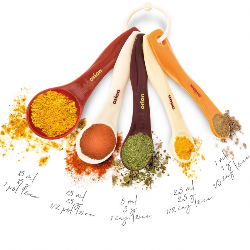 Sada odměrek 1 g/ml, 2,5 g/ml, 5 g/ml, 7,5 g/ml a 15 g/ml. Pečení vyžaduje přesné odměřování surovin a tento set 5 odměrek je ideálním pomocníkem. Odměrky do sebe dokonale zapadají, což usnadňuje jejich skladování. S nimi bude vaše pečení a vaření o poznání jednoduší. Materiál: plast. Rozměry: 1 g/ml – pr. 1,8 cm, d. 10,5 cm, 2,5 g/ml – pr. 2,2 cm, d. 10,7 cm, 5 g/ml – pr. 2,7 cm, d. 11,2 cm, 7,5 g/ml – pr. 3,1 cm, d. 11,4 cm a 15 g/ml – pr. 4 cm, d. 12 cm.| Výrobce: | Orion |