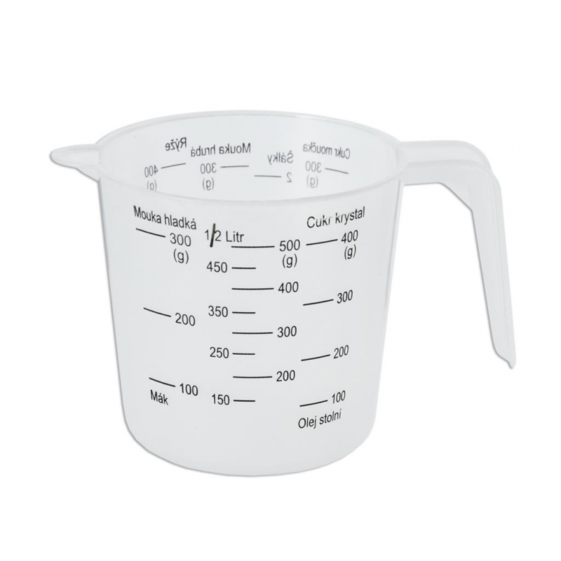 Odměrka s uchem a výlevkou. Odměrky na tekutiny, cukr, mouku, olej, mák, rýži. Materiál: plast. Transparentní. Rozměry: objem - odměrka do 500 ml, pr. 10 cm, v. 10 cm.| Výrobce: | Orion |