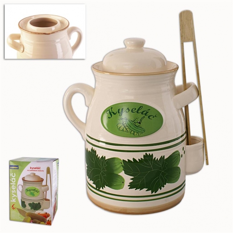 Hrnec kyseláč 6l můžete využít nejen na nakládání zelí ale uvidíte, že nalezne široké uplatnění ve Vaší kuchyni. Hrnec využijete při přípravě veškerých nakládaných pokrmů jako jsou kvašáky, utopenci, ryby, sýry, nakládané okurky, nakládané maso a další pochoutky nakládané do oleje nebo octového zálivu. Zelák je vyroben z prvotřídní keramiky, která je opatřena glazurovaným povrchem. Glazura je uvnitř hrnce i vně. Keramika s glazurou nepropouští světlo a pomáhají udržovat stálou optimální teplotu. Uložené potraviny pak získají lepší podmínky pro dozrání a správnou chuť. Díky přírodnímu materiálu je zaručena 100% zdravotní nezávadnost. Nákupem získáte kompletní set hrnce, pokličky a dřevěných kleští. Hrnec má dvě praktická boční ucha a šikovnou kapsu na zachycení odkapávací tekutiny z kleští. Tato šestilitrová verze je navíc opatřena žlábkem do kterého nalijete vodu pro zajištění správného procesu kvašení. Obsah balení: Hrnec, Poklička, Dřevěné kleště Rozměry: Objem [l]: 6 Průměr [cm]: 20,5 Výška [cm]: 32