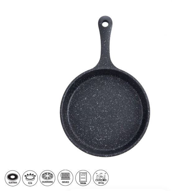 Odlévaná masivní pánev s velmi kvalitním nepřilnavým povrchem PFLUON GRANIT. Můžete na ni smažit, dusit, opékat s minimální potřebou tuku, připravíte jíšku, vajíčka (menší porce). Tato celokovová pánvička nabízí možnost zapékání v troubě a následně servírování na prkénku. Materiál: hliník s vynikajícím nepřilnavým povrchem PFLUON GRANIT a s profilovaným dnem. Možnost zavěšení. Rozměry: pr. 16 cm, vnější pr. 17 cm, v. 3,4 cm, celková v. 4,7 cm, d. 27 cm. Vhodná na všechny typy spotřebičů včetně indukce a trouby. Lze mýt v myčce na nádobí, avšak vlivem agresivních čisticích prostředků může dojít k nepatrné oxidaci dna. Tento stav nemá vliv na proces vaření, není zdravotně závadný a nemůže být důvodem reklamace. Pokud se chcete tomuto vyhnout, nádobí v myčce nemyjte. Doporučujeme použití kuchyňské chňapky, držadlo pálí, dbejte zvýšené opatrnosti.| Výrobce: | Orion |