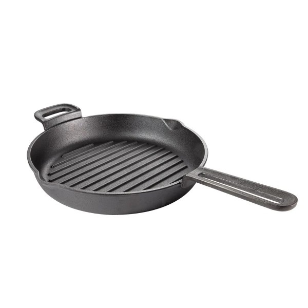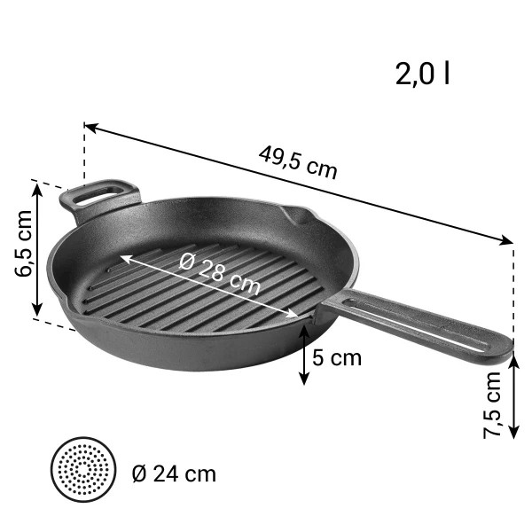 Masivní litinová pánev MASSIVE je ideální pro grilování masa, ryb a zeleniny i přípravu řady dalších pokrmů v domácí kuchyni. Silnostěnná litina vyniká vysokou akumulací tepla a pokrmy připravované v nádobí MASSIVE jsou velmi rychle a zároveň dokonale propečené. Není tajemstvím, že tento typ nádobí je vyhledávaný zejména milovníky dokonale propečených steaků. Specifickou vlastností litinového nádobí je jeho ochranná nepřilnavá vrstva, kterou je nezbytné vytvořit ještě před jeho prvním použitím. Příprava ochranné vrstvy je snadná. Vznikne vypálením tenké vrstvy oleje nanesené na celý povrch nádobí a zahřátím na sporáku nebo v pečicí troubě. Litinové nádobí s vytvořenou ochrannou vrstvou má přirozeně nepřilnavé vlastnosti a je dobře chráněno proti korozi. Důležité přitom je, že vynikající vlastnosti správně používaného i udržovaného litinového nádobí se zvyšují s každým jeho použitím. Litinové nádobí je určeno pro přípravu pokrmů na grilech a plynových sporácích, je vhodné i pro použití v Power grilu PARTY TIME. Díky masivní odlévané konstrukci je litinové nádobí mimořádně odolné a trvanlivé. Myje se bez použití chemikálií, stačí jej vyčistit houbičkou pod tekoucí vodou a dobře osušit. Materiál: masivní železná litina (Cast iron). Čištění: čistěte po každém použití pod tekoucí vodou a osušte, nepoužívejte čisticí prostředky. Záruka: 5 roků.