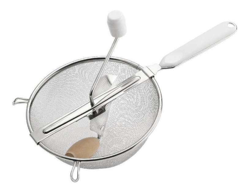 Jemné pasírovací síto z nerezové oceli, s plastovou rukojetí, vhodné pro přípravu šťáv nebo pyré z ovoce a zeleniny. Je osazeno opěrkami pro pohodlné a bezpečné umístění na mísu nebo hrnec a má odnímatelný pasírovací mechanismus, bez kterého jej můžete využívat jako klasické síto. Průměr síta je 200 mm. Materiál: nerezová ocel, plast ABS, pasírovací váleček z tvrdého dřeva.| Výrobce: | Westmark |
