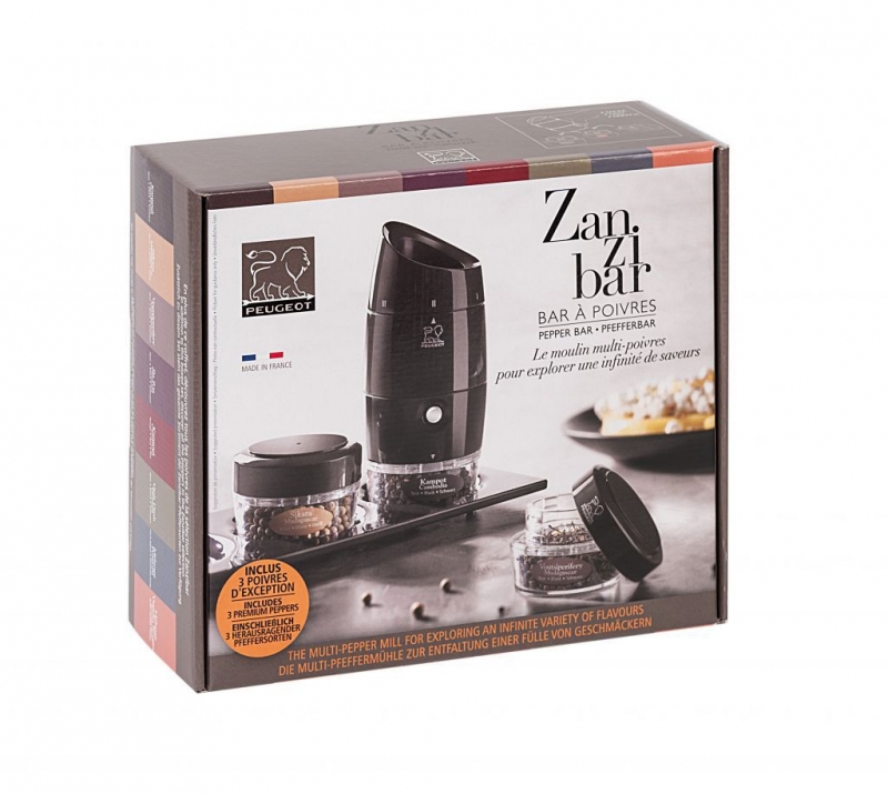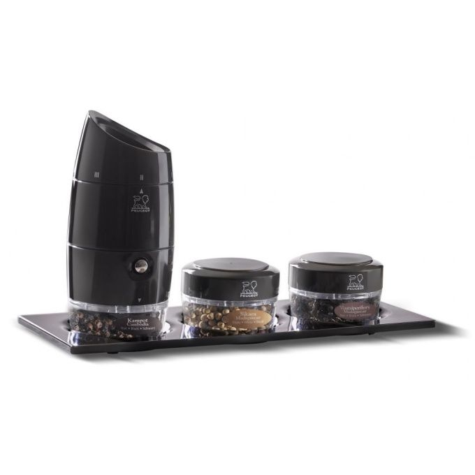 Sada mlýnku na pepř se zásobníky je charakteristická svým moderním designem, který se hodí do luxusních a moderních interiérů, spojuje v sobě moderní materiály s tradičním způsobem výroby a kvalitou firmy Peugeot. Tento set je ojedinělý koncept vytvořený pepřovým expertem Gérardem Vivesem. Peugeot Zanzibar Mlýnek na pepř set se 3 zásobníky 13 cm je vybaven patentovaným mlecím mechanismem U-Select, což je moderní, patentovaný systém firmy Peugeot, který strojku dovoluje přesné automatické nastavení hrubosti mletí od jemných kousků pepře až po větší kousky. Mlýnky firmy Peugeot jsou uznávány jako nejlepší mlýnky v celosvětovém měřítku a jsou součástí vybavení předních světových šéfkuchařů a labužníků. Čištěte jej vlhčeným hadříkem a na spodní část mechanismu použijte kartáček. Záruka na systém nastavení hrubosti mletí a samotný mlýnek je 5 let. Doživotní záruka se vztahuje na mlecí mechanismus. Peugeot Zanzibar Mlýnek na pepř set se 3 zásobníky 13 cm, klíčové vlastnosti: set obsahuje mechanický mlýnek s nastavitelnou hrubostí mletí, 3 zásobníky s pepřem (pepř Kampot z Kambodži, bílý pepř Sikara z Madagaskaru, divoký černý pepř Voatsiperifery z Madagaskaru) a tácek na odložení zásobníky jsou snadno vyměnitelné speciální mlecí mechanismus vyvinutý speciálně na pepř baleno v dárkové krabici k mlýnku lze dokoupit další druhy pepře a koření viz související produkty pepř Kampot z kambodžské provincie kampot je pepř se sladkým, opojným a mírně květinovým nádechem, výborně se hodí k červenému masu, pomalu vařeným pokrmům, studeným pokrmům, tučnějším rybám apod. bílý pepř Sikara z Madagaskaru je vhodný na škeble, ústřice, bílé maso, drůbež, bílé rybí maso, vepřové a telecí maso apod. divoký černý pepř Voatsiperifery z Madagaskaru je ideální do sezónních salátů, na vepřové a jehněčí maso, k bílému rybímu masu, je rovněž ideálním doplňkem měkkých bílých sýrů apod.