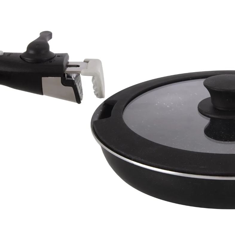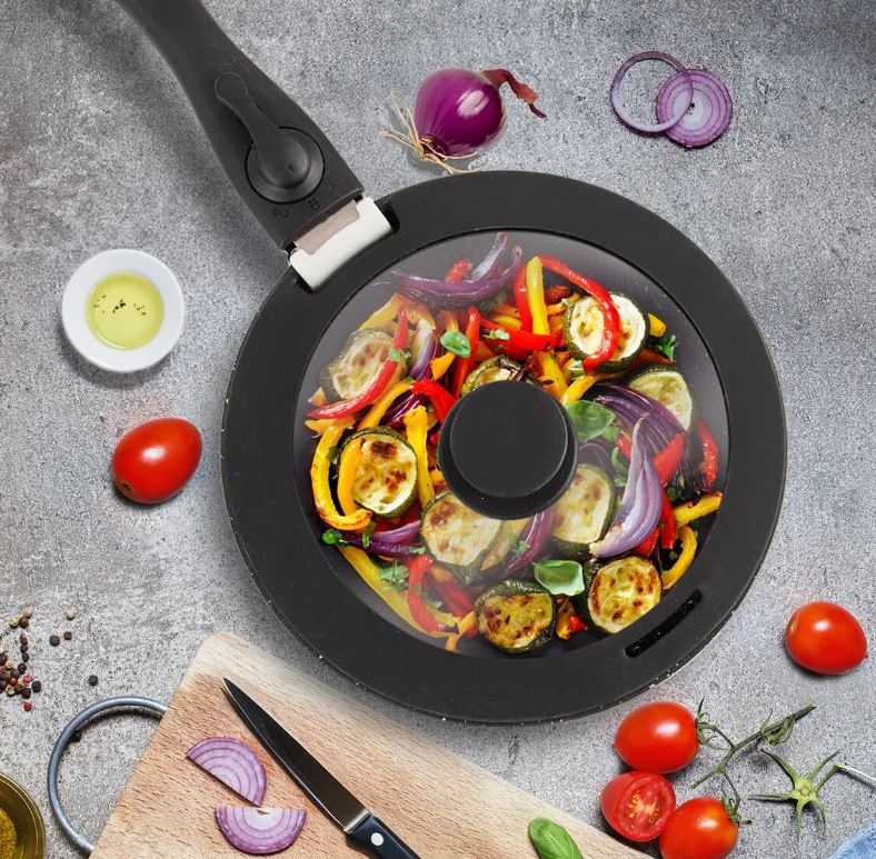 Skleněná poklice se silikonovým úchytem a okrajem je opatřena otvorem pro únik přebytečné páry/pro cezení potravin. Celý popis >