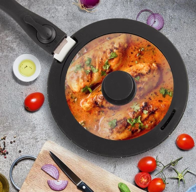Skleněná poklice se silikonovým úchytem a okrajem je opatřena otvorem pro únik přebytečné páry/pro cezení potravin. Celý popis >