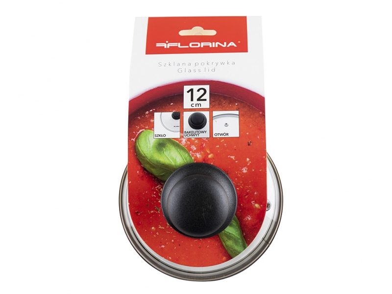 Univerzání poklice z tvrzeného skla s kovovým okrajem, plastovým úchytem a otvorem pro únik páry, průměr 12 cm.Nevhodné do trouby.