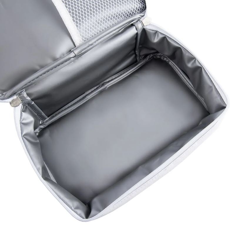 Materiál: vnější část tkanina oxford, výplň 3 mm perlová bavlna, hliníková fólie (vnitřek), 100% polyester (poutko + síťka uvnitř), kov + polyester (zip).