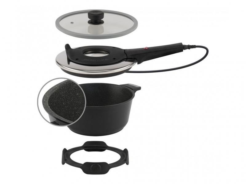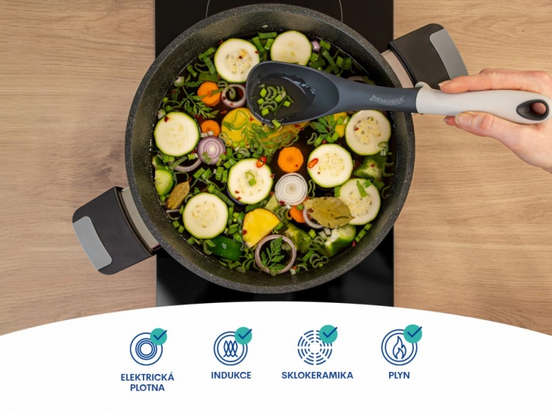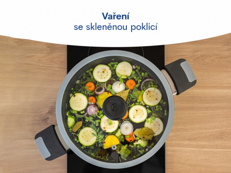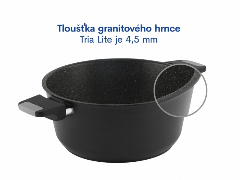 objemný hrnec o průměru 28 cm, výšce 13 cm a s 4,5 mm silným dnem. Hrnec je z vnitřní i vnější části potažen třívrstvým nepřilnavým povrchem s částečkami oxidů titanu. Touto povrchovou úpravou získává větší odolnost vůči mechanickému poškození. Hrnec je určen pro použití na všech typech sporáků včetně indukce. K hrnci jsou namontována teplotně odolná ucha, takže se nemusíte bát ani zapékání v troubě.