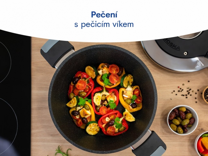 třívrstvým nepřilnavým povrchem vyztuženým částečkami oxidů titanu. Horní část víka je vyrobena z nerezového plechu, dolní část víka je z hliníku a je potažena nepřilnavým povrchem Teflon® Classic. Přebytečná pára, vznikající při pečení, je odváděna dutými šrouby ve víku. Pečicí víko má skleněné okénko.