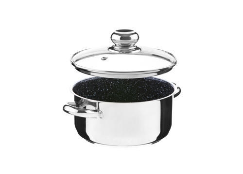Vyrobeno z potravinářské nerezavějící oceli CrNi18/10 pro 100% zdravotní nezávadnost. Nádoba je vyrobena z velmi pevného plechu silného 0.8 mm. Skleněná poklice s parním ventilem je vyrobena z bezpečnostního temperovaného skla. Odtokovými drážkami pod úchyty poklic odtéká voda po mytí v myčce. Používáme odolný keramický povrch bez obsahu PTFE a PFOA od švýcarské firmy ILAG. Akumulační sendvičové dno A-THERM INDUCTION uspoří energii při vaření.Je vhodné na všechny druhy sporáků - indukční, plynové, elektrické a sklokeramické. Má široký odlévací okraj pro snadné přelévání bez ukapávání a zašpinění nádoby. Snadno se čistí a udržuje, vhodné mýt v myčkách nádobí.