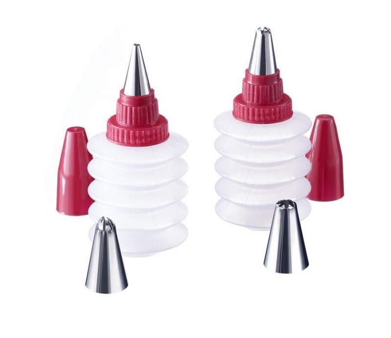 Sada 2 kusů dekoračních lahví a 4 nerezových nástavců pro plnění a zdobení dortů a zákusků. Celý popis >