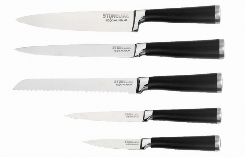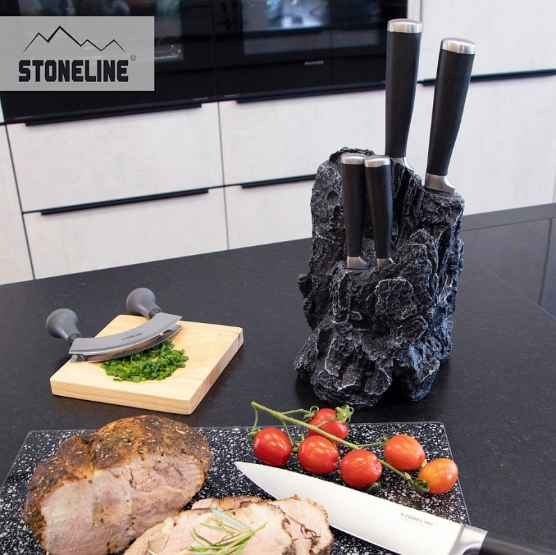 Legendární STONELINE® EXCALIBUR® v skalním bloku je skutečným vrcholem vaší kuchyně! Tento unikátní blok nožů bezpečně pojme pět speciálních nožů pro každou příležitost. Aby bylo zajištěno, že nože jsou vždy ostré, je blok nožů dodáván s brusným kamenem pro pohodlné broušení.