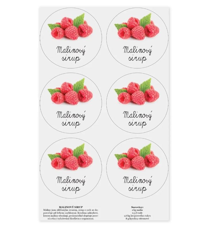 Samolepky na láhve nebo sklenice s domácím malinovým sirupem označí i ozdobí váš domácí produkt. Celý popis >