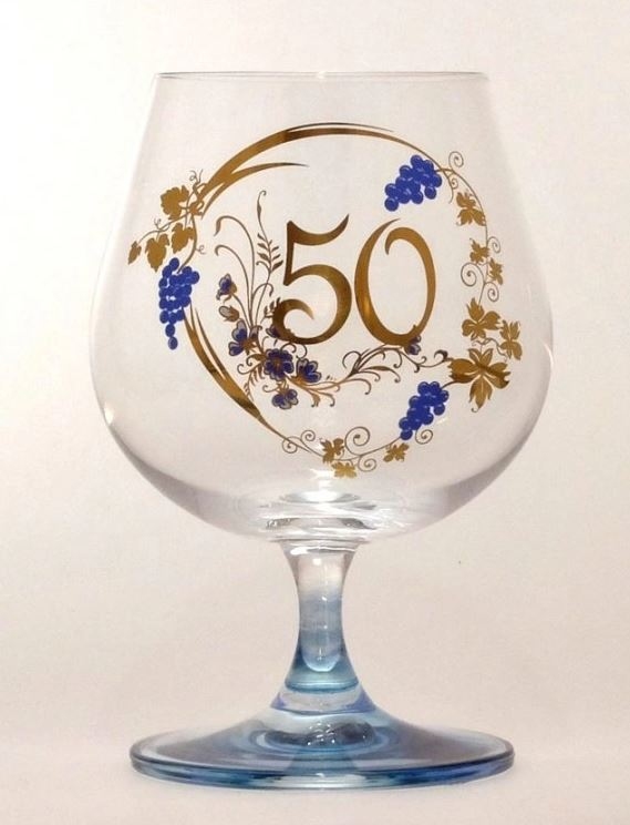 Elegantní jubilejní sklenice k narozeninám. Klasická dekorovaná výroční sklenice. Celý popis >
