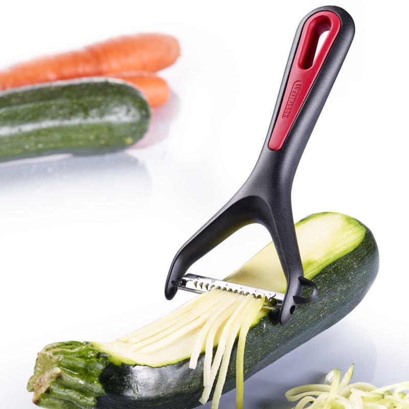Kvalitní škrabka na zeleninu s příčnou, speciálně tvarovanou, nerezovou čepelí, s rukojetí vyrobenou z vysoce kvalitního plastu. Tato škrabka vám snadno vykouzlí z různých druhů ovoce a zeleniny úhledné nudličky.Garance 5-ti let záruky.Vhodné mýt v myčce na nádobí.Materíaly: PP,TPE - vysoce kvalitní plast, INOX - nerezová ocel.Rozměry: 150 x 69 x 18 mm.| Výrobce: | Westmark |
