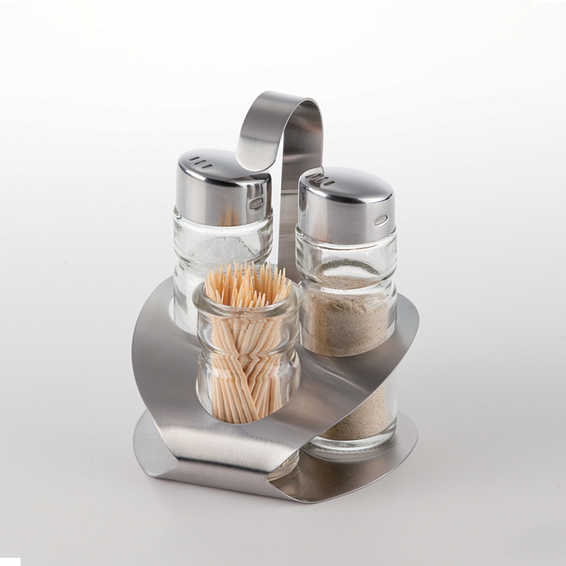 Dochucovací souprava je vhodná pro sváteční stůl. Má elegantní provedení. Nerezový stojánek a 2 kořenky a dózu na párátka. Celý popis >