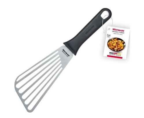 Ideální pro zvedání a otáčení smažených a grilovaných potravin na grilovacích deskách,.. Štěrbiny zajišťují, že přebytečný tuk může odkapávat. Obalovaná vrstva pokrmu se nepoškodí díky menší kontaktní ploše s masem. Celková délka: 29,5 cm, velikost čepele: 16,5 x 8,5 cm. Kov je zalitý v materiálu rukojeti a vytváří tak extrémně stabilní spojení. Barva: černá, stříbrná.| Výrobce: | Westmark |