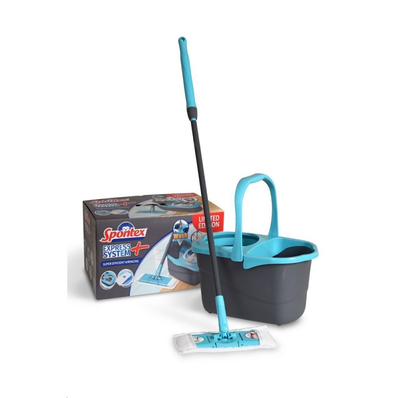 Praktický úklidový set od Spontexu nabízí kompletní řešení pro vytírání všech typů podlah, nyní s vylepšenou technologií. Díky systému express můžete vytírat bez styku se špinavou vodou. Součástí balení je vědro se ždímacím mechanismem a mop s návlekem z mikrovlákna (rozměr 33x14,5 cm). Kbelík je opatřen ryskou max.a dvěma částmi. V první části náhradu vymácháte a o vroubkované strany zbavíte nečistot, v druhé části mop vyždímáte. Míru vlhkosti mopu ovlivníte délkou ždímání. Ždímací systém je zabudovaný v rukojeti, takže ždímání provádíte pouze jednou rukou. Pro narovnání spodní části mopu po ždímání na mop nešlapejte, ale jednoduše mírně sklopte násadu (tyč) a spodní část mopu se sama automaticky kliknutím narovná. Návlek z mikrovlákna je vysoce absorbční. Novinkou je otvor uprostřed násady díky kterému mop nasadí ve ždímací části a vyždímáte jej. V původním express systému byl plastový košíček, který umožňoval ždímání, nyní je kbelík tedy bez košíčku, ždímání je efektivnější a čištění kbelíku snažší. Vědro je opatřeno výlevkou pro snadné vyprázdnění a rukojetí pro snadné přenášení. Rozměr vědra 30x49,5x27 cm (šxdxv). Náhrada z mikrovlákna je pratelná (vždy perte bez změkčovadel).