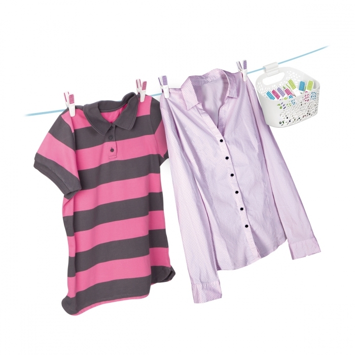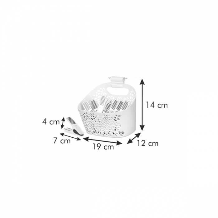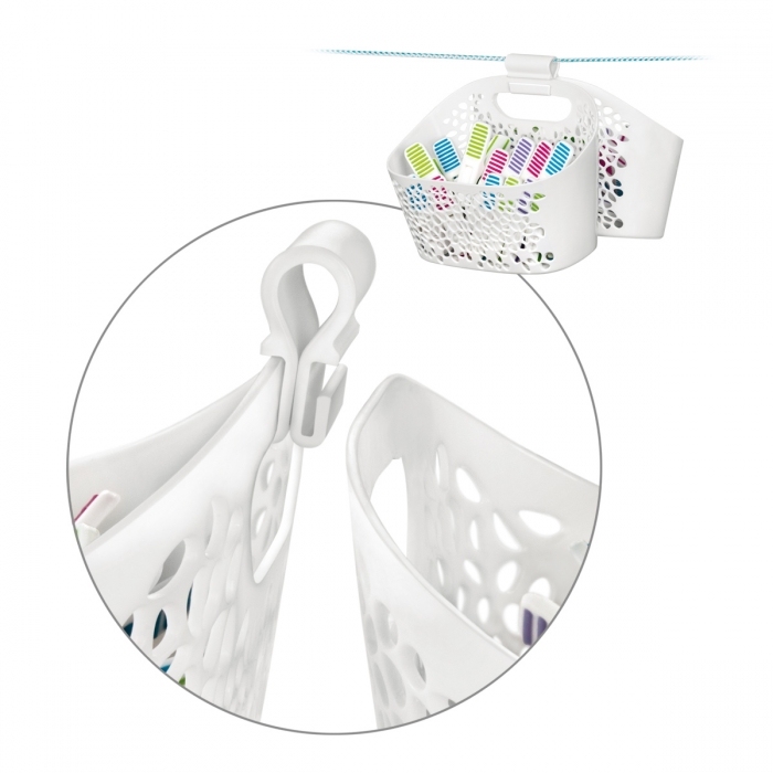 závěsný košík o rozměru 19x12x14 cm, kolíčky jsou barevné o rozměru 7x4 cm Celý popis >